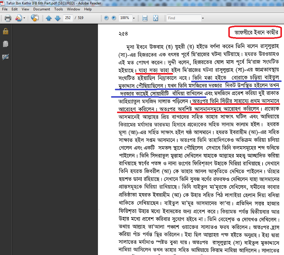 অর্থঃ “রাসুলুল্লাহ(ﷺ) যখন বাইতুল মুকাদ্দাসের কাজ শেষ করলেন তখন তাঁর জন্য মিরাজ (সিঁড়ি) আনা হল এবং এতে করে তিনি আসমানে গমন করেন। বুরাকে করে যাননি। যেমন কতিপয় মানুষ তা ধারণা করে থাকে। বরং বুরাক বাইতুল মুকাদ্দাসের দরজায় সাথে বাঁধা ছিল যেন তাতে করে তিনি আবার মক্কায় ফিরে আসতে পারেন।” [21]